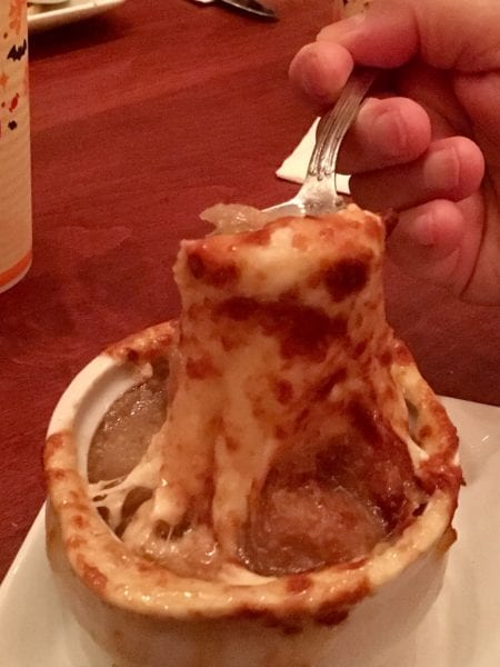 But the star of any French Onion Soup and where I make my most judgement is the cheese, and here there was plenty! I’m not sure what kind they used, if it was just Gruyere or a mix of cheeses, either way I fell in love. Look at that stringiness: