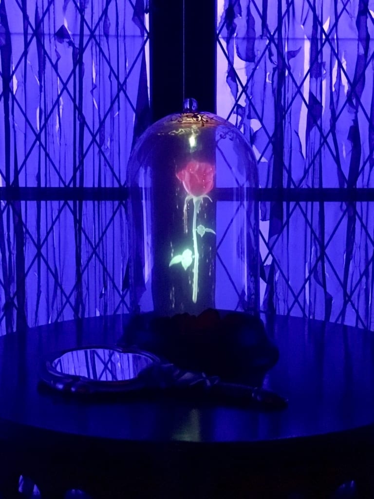 The famous rose from the movie to which the spell is tied is waiting over in the far end of the room, beyond the curtain: