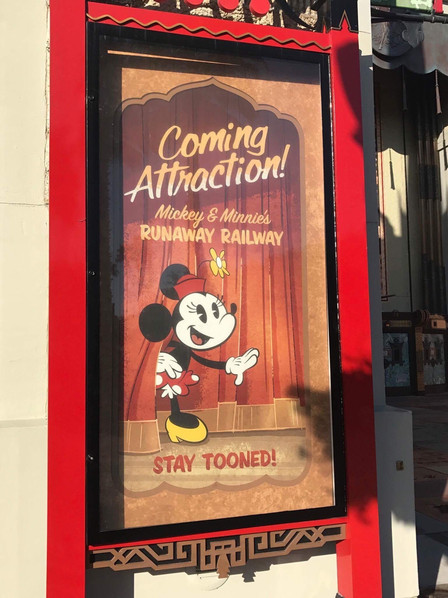 The Great Movie Ride isn’t even cold yet and Disney is wasting no time trying to make guests feel like it’s only a distant memory. At Disney’s Hollywood Studios you can now see Mickey and Minnie’s Runaway Railway signs up near the old entrances to The Great Movie Ride, getting fans excited for the new attraction! Thanks to Twitter user: @GavinAndPatrick we got a look at them:
