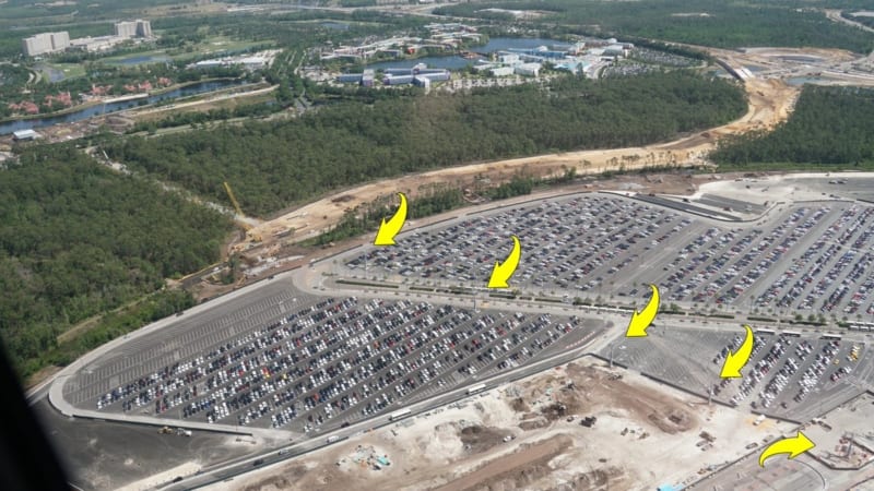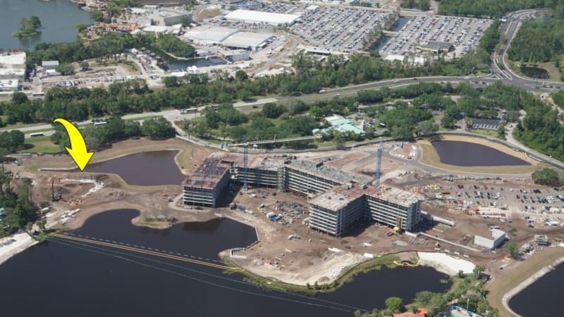 For example, from the Caribbean Beach station you can either continue up to Epcot, or make a detour here and head over to Disney’s Hollywood Studios through that clearing in the trees. One of the support towers is being raise where the yellow arrow is: