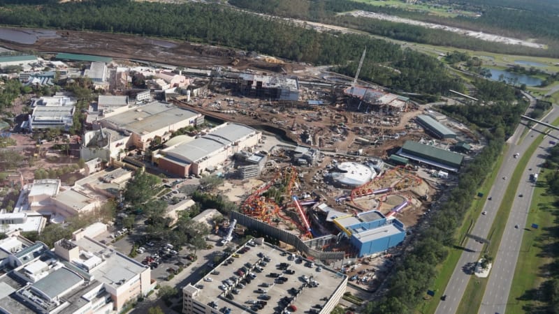 Panning out you can see how much real estate the Slinky Dog Dash Coaster takes up, it’s literally half the size of Toy Story Land. Alien Swirling Saucers is the big ovalish building in the center and the white roof looks almost totally complete: