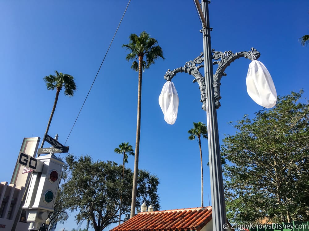 Since Disney’s Beach Club is very close to Hollywood Studios, I decided to head over and see how the storm preparations were going. It’s incredible the level of detail Disney goes about taking when preparing for a hurricane. For example here are some street lamps on Hollywood Blvd that are covered in plastic bags.